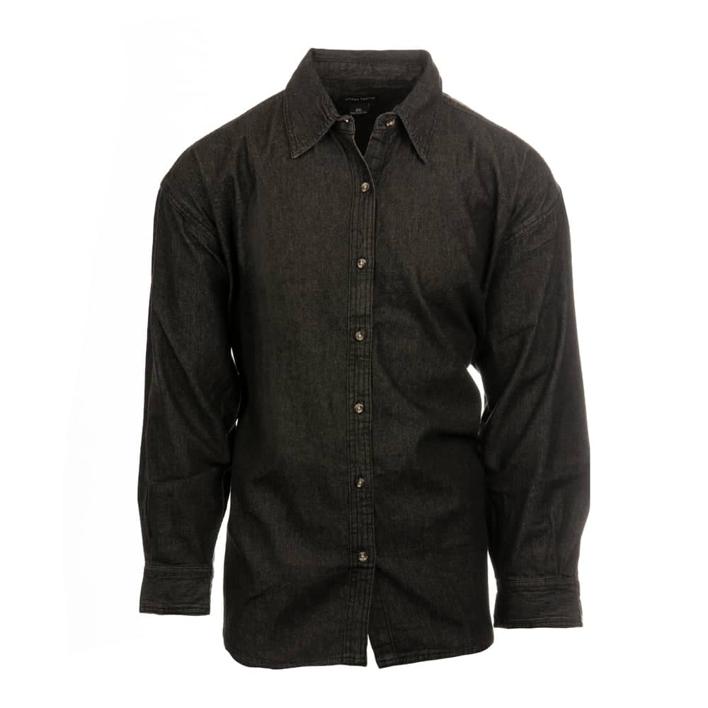 Sierra Pacific Ladies Long Sleeve Denim Shirt, 220gsm, 100% cotton denim, Button-down collar, Adjustable cuffs, Double-needle stitching, Felled seams, Wood style buttons, Dark denim is stonewashed