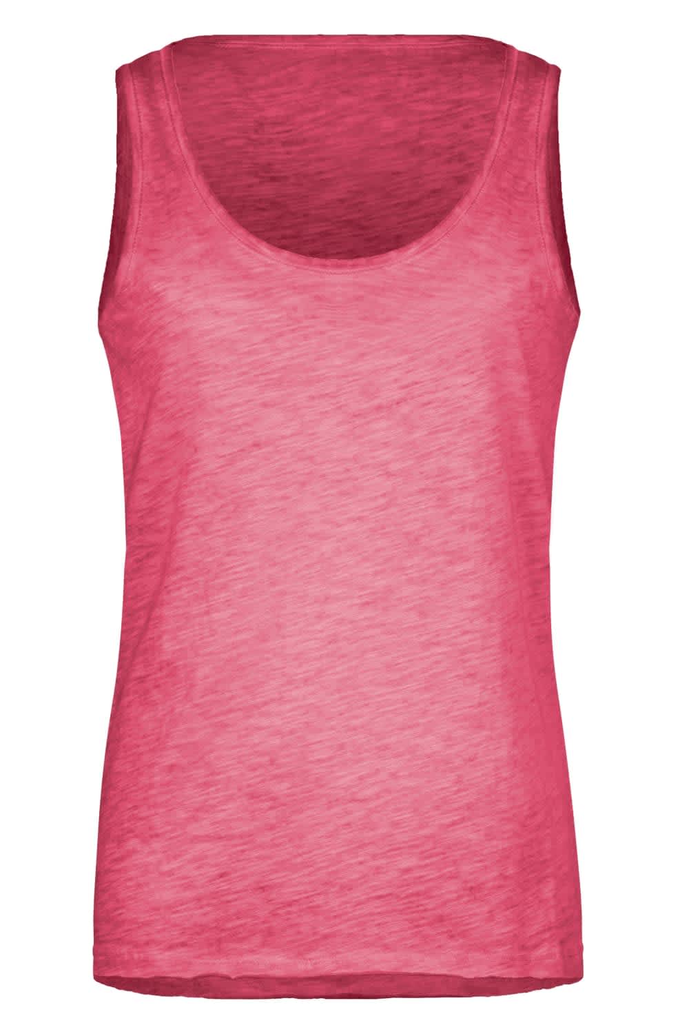 Single Jersey Made Of Slub Yarn And Combed Ring-Spun Organic Cotton Elaborate Spray Print Technique Two-Ply Roll Hem Narrow Bands On Neckline And Armlines Lightly Waisted