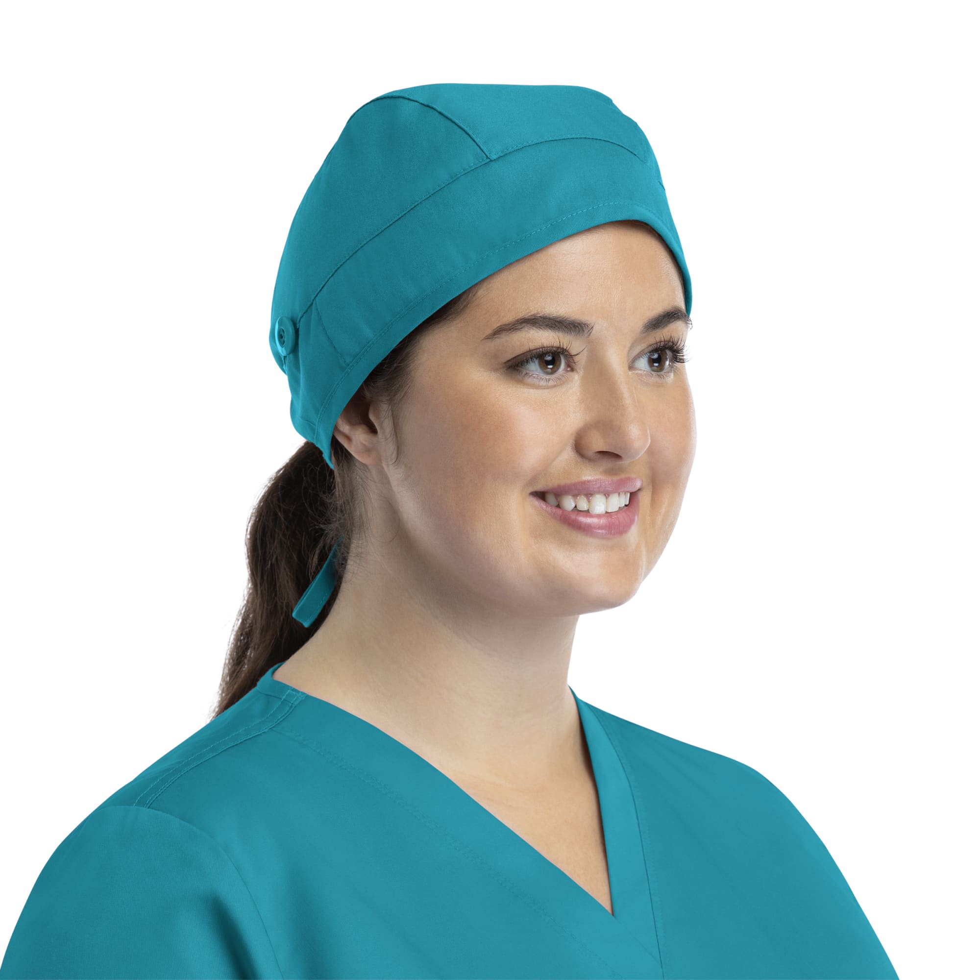 Scrub Cap with side buttons *Cotton rich, stretch fabric *ultra soft *cool feeling *light weight *features a white terry – cloth sweatband *back elastic *adjustable, tie back closure *one size fits all *available in solid colors