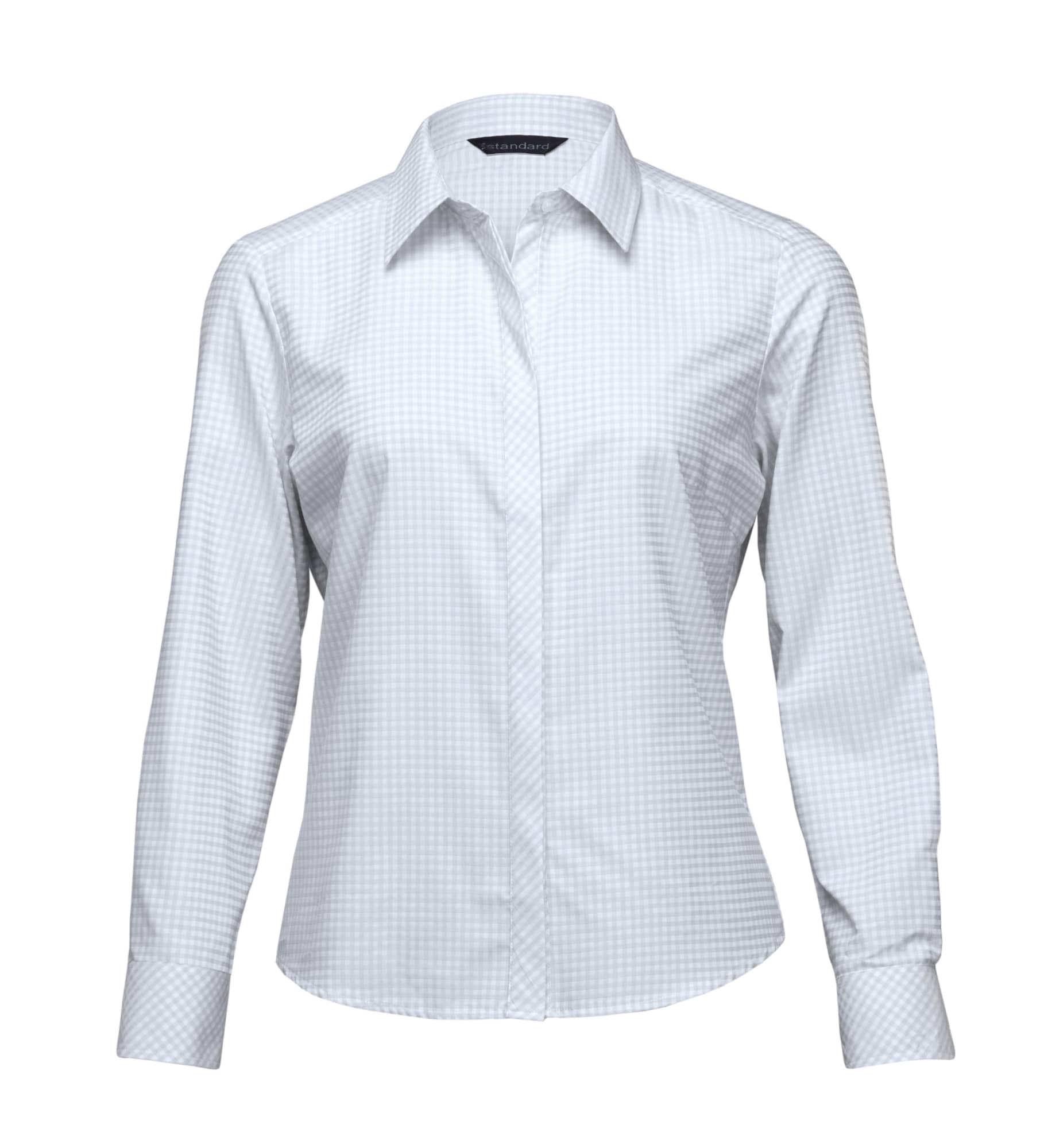 65% polyester 35% cotton jacquard yarn dyed check|Fashion collar|Shaped body detailing front and back|Long sleeves|Concealed plaquet|Contoured hem